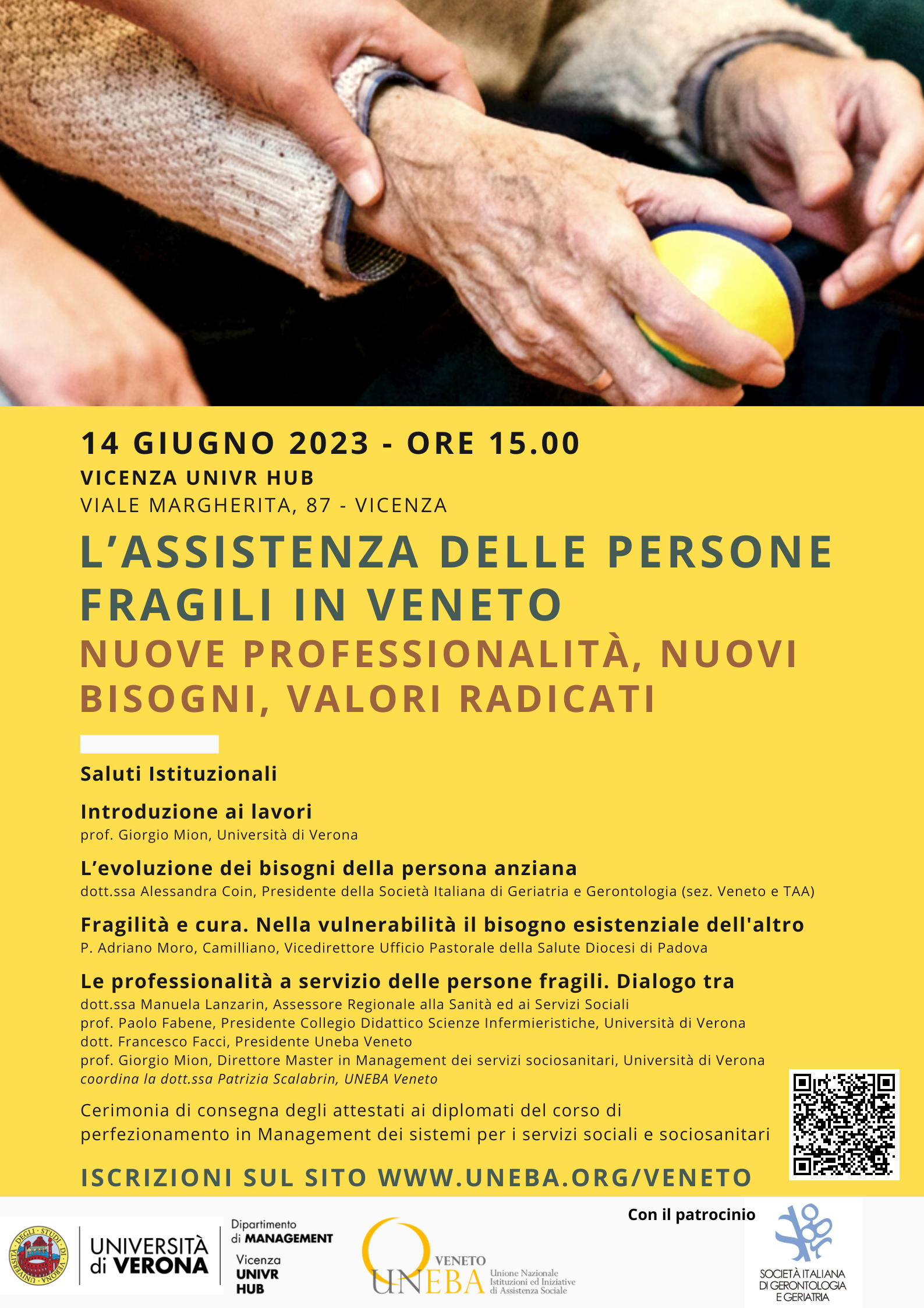 L'iniziativa, organizzata dal Dipartimento di Management e da UNEBA Veneto, con il patrocinio della Società Italiana di Geriatria e Gerontologia e realizzata in occasione della consegna degli attestati ai diplomati nel Corso di Perfezionamento in Management dei sistemi per i servizi sociali e sociosanitari (a.a. 2021/22) e della presentazione del Master in management dei servizi sociosanitari, avrà luogo