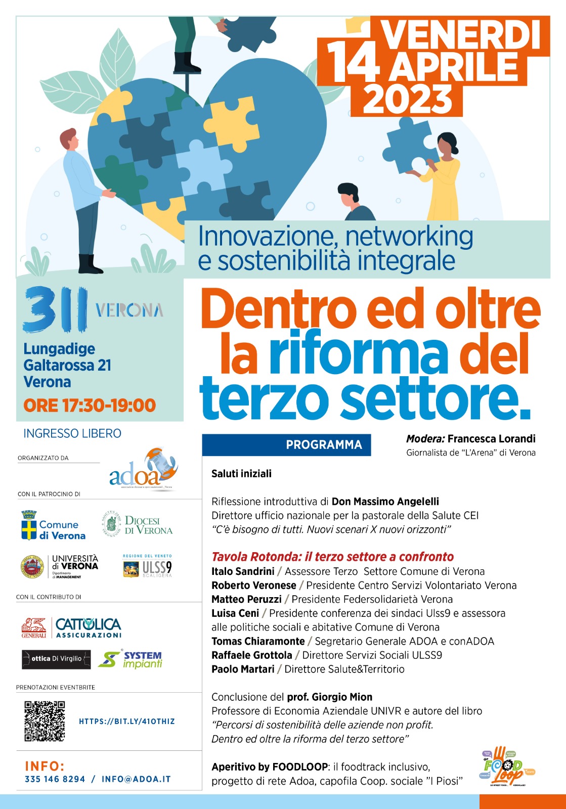 L’Associazione Diocesana delle Opere Assistenziali (ADOA), network etico e incubatore di buone prassi nelle azioni di cura, affiancamento e supporto di Enti del Terzo Settore, Istituti religiosi ed organizzazioni di origine ecclesiale del territorio della Diocesi di Verona che si occupano di supporto e cura della vulnerabilità per anzianità, disabilità, solitudine o marginalità sociale. L’attenzione al dinamico intreccio tra cura della persona e buona organizzazione ha condotto ADOA a sviluppare percorsi di miglioramento continuo e formazione, in particolare per approfondire i temi propri del terzo settore e del miglioramento della modalità di presa in carico organizzata delle persone più vulnerabili della società. Dagli spunti offerti da una recente ricerca sul tema condotta dal prof. Giorgio Mion, professore del Dipartimento di Management dell’Università degli Studi di Verona, raccolta nel libro edito da Giappichelli dal titolo “Percorsi di sostenibilità delle aziende non profit. Dentro e oltre la riforma del terzo settore” nasce l’idea di un confronto pubblico tra alcuni dei rappresentanti più significativi del mondo non profit veronese. Convergere concretamente, confrontarsi periodicamente e intessere relazioni di prospettiva e di senso sui temi strategici del bene comune consente di dare vita a processi capaci anche di dare sostenibilità integrale e futuro ad un mondo di primaria importanza per la tenuta della sanità, del sociale e della comunità in genere: il terzo settore.
