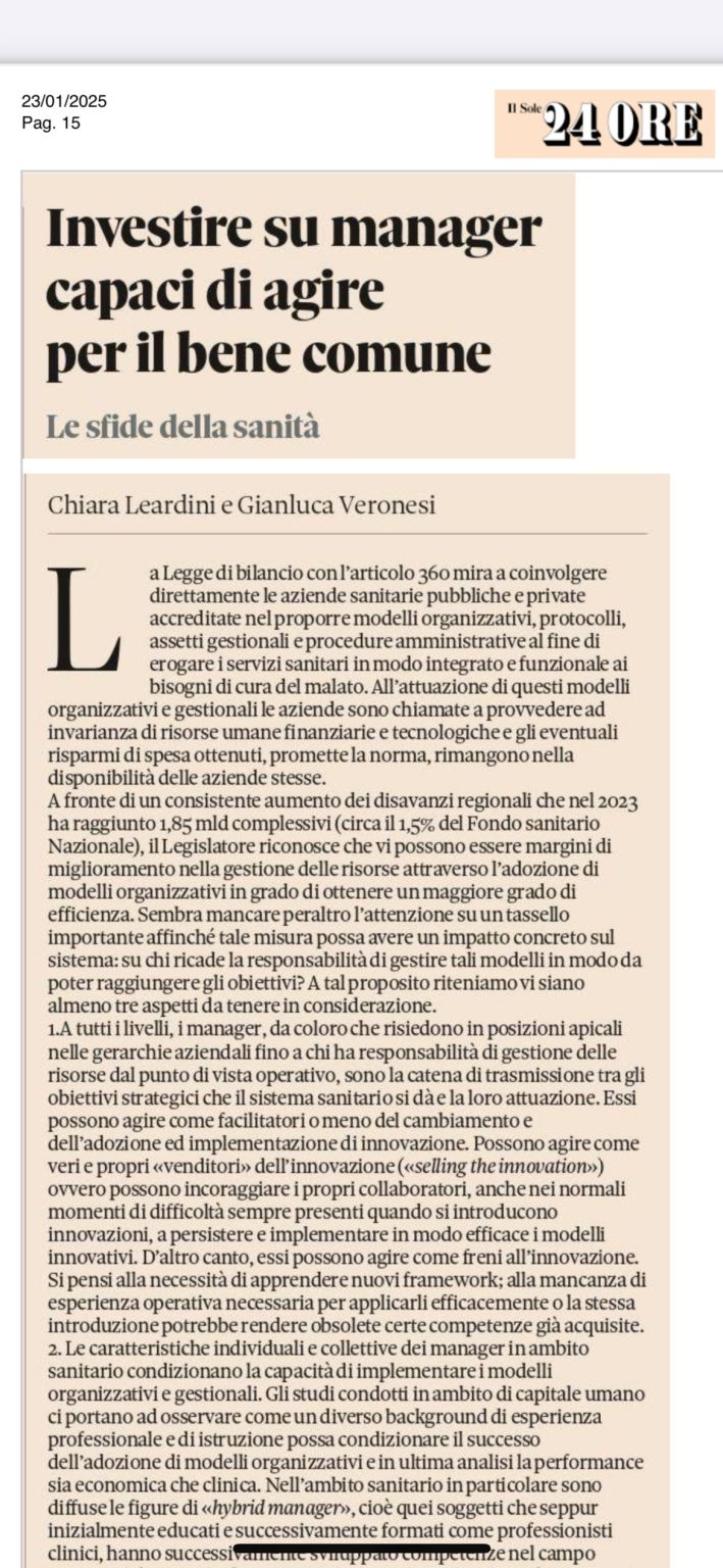 L'innovazione svolge un ruolo particolarmente importante nel settore sanitario, dove le risorse limitate devono soddisfare le crescenti esigenze sanitarie in un contesto di crescente incertezza e complessità. Tra la fiorente letteratura sull'adozione dell'innovazione, alcuni studiosi si sono concentrati sugli antecedenti ambientali e organizzativi dell'adozione dell'innovazione a livello organizzativo, prestando meno attenzione alle caratteristiche individuali dei manager. Pertanto, solo un numero limitato di studi ha dimostrato come le caratteristiche, gli atteggiamenti e le aspirazioni dei manager possano influenzare l'adozione dell'innovazione da parte dell'organizzazione. In relazione al settore sanitario, ricerche precedenti si sono anche concentrate sul ruolo dei middle manager, dimostrando come i loro comportamenti possano facilitare l'implementazione di soluzioni innovative a livello organizzativo.