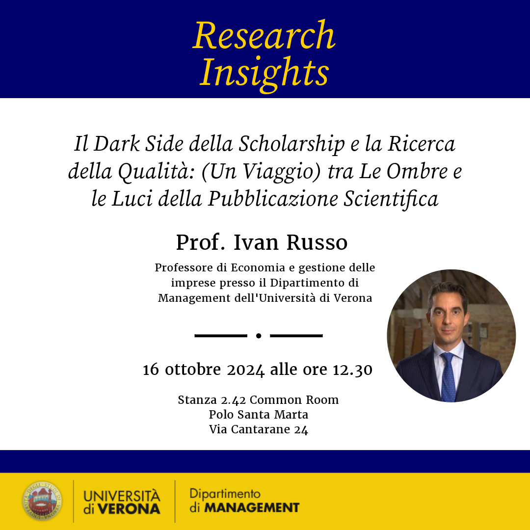 Il seminario sarà tenuto dal prof. Ivan Russo (Università degli studi di Verona) sul tema: “Il Dark Side della Scholarship e la Ricerca della Qualità: (Un Viaggio) tra Le Ombre e le Luci della Pubblicazione Scientifica” presso la Common room - stanza 2.42 - Polo Santa Marta.